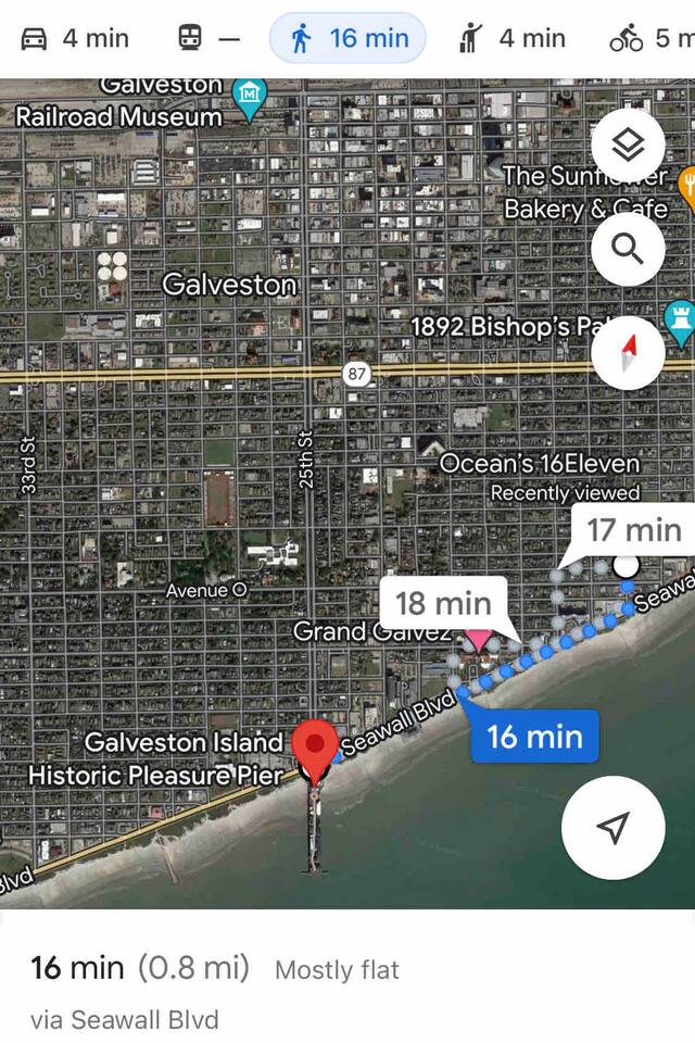 Walking distance to: - the beach! - Pleasure Pier - Murdochs - Shykatz's Cafe & Bakery - Saltgrass Steakhouse - Miller's Seawall Grill - Benno's on the Beach - Trolley stops